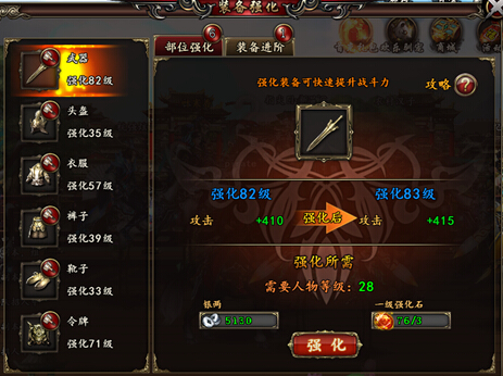 想要强化的部位,再点击强化按钮,消耗对应的银两和强化石即能强化成功。
